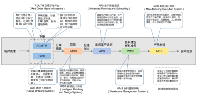 1. 客户需求入口:客户下单与订单数据采集。B端客户通过RCMTM平台、C端客户通过电脑或手机等终端平台,登陆其各自账号,输入量体尺寸,选择款式、工艺、风格、面辅料搭配等要求进行下单。随后,系统同时自动保存提交的信息,并实时传送至工厂大数据中心。对全球任何地区的客户订单,数据都能够实现零时差、零失误的传输。