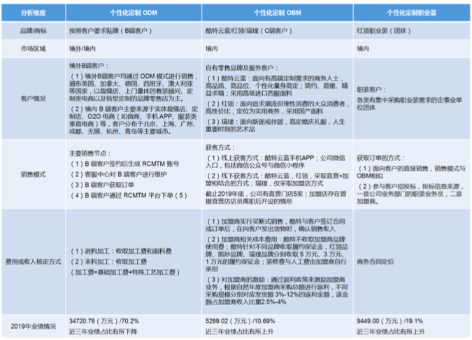 酷特智能以个性化定制为核心的服装生产及销售,主要包括个性化定制ODM、个性化定制OBM、个性化定制职业装三种销售模式。对于境内外的B端客户,公司以贴牌方式进行生产;对于境内的C端客户以及职业装团体订单客户,公司以自有品牌进行生产销售。ODM模式,是酷特为B端客户提供产品开发、设计、改进、设备投入、生产、售后、市场反馈的全过程,将个性化定制融合在整个的设计加工过程。OBM模式,是酷特自建品牌,进行市场定位,产品设计、制造、营销渠道建立,及品牌的打造。(表3:酷特智能三种销售模式的对比梳理)