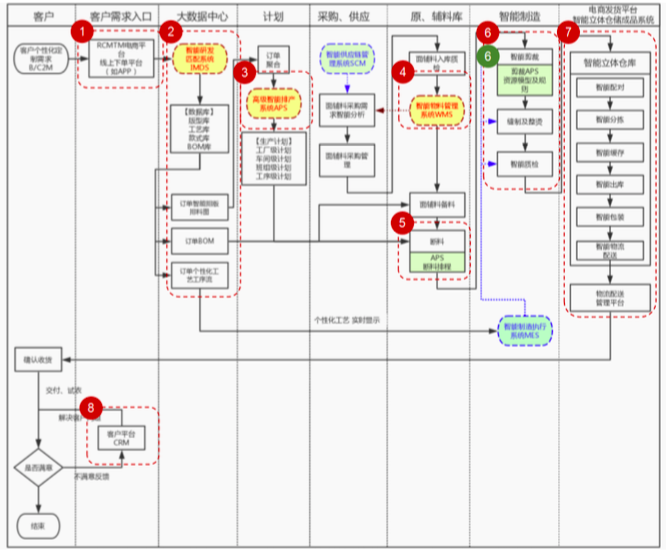 4. 原、辅料库:智能物料采购与原材料仓储管理。基于精准射频识别技术(RFID)的智能仓储管理系统,能够实现原辅材料的实时同步物联网化管理;建立智能仓储管理系统(WMS),能够确保按计划完成前期材料的备料、断料、出库及配送。