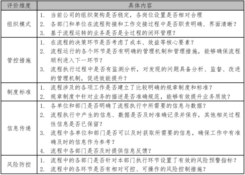 针对以上五个要素针对流程进行评估,实际上是对流程所定位的业务的一种系统化的审视,将流程的运行与公司组织架构的匹配性、管控措施的具体性、制度标准的准确性、信息传递的通畅性、风险防控的有效性进行了密切关联。一项好的流程,必然是在以上五个方面的能够很好的契合公司的部门和岗位设置,职责分工明确、各项支撑文件完备,并且促使该项业务高效有序运转。