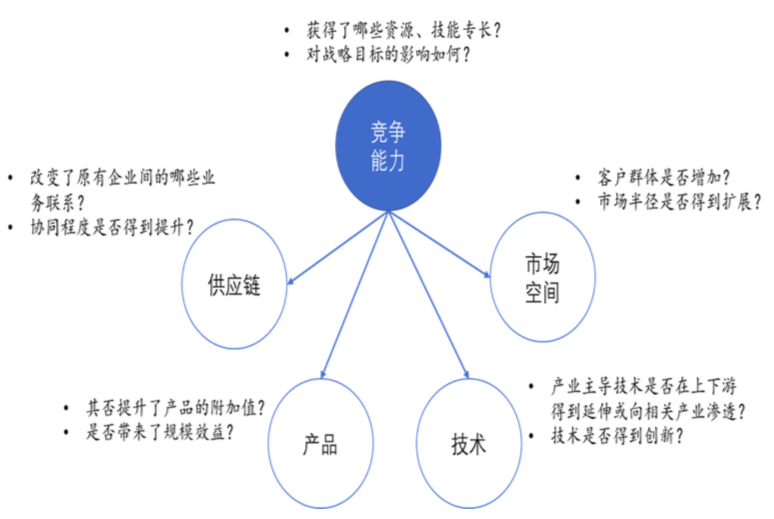 产业整合的相关理论研究观点丰富,较有代表性的一是从市场的资源配置效率出发的“结构—行为—绩效”分析范式,主要考察市场集中度、进入壁垒、产品差别化程度等市场结构状况对企业价格和产量决策的影响;二是从交易费用理论出发,以成本节约的程度与资产专用性程度、资产被利用的频繁程度和环境的不确定程度等因素分析产业整合的价值;三是从企业能力理论出发,解释产业整合是重新调整企业间能力分布,从而带来经营价值的过程。各种理论多来自产业经济学的经典理论,也不乏诺贝尔大神的加持,确实带来很多有益的启示,伟德国际betvlctor1946从经典理论研究和咨询实践出发,提出了“1+4”产业整合评估模型,既一个核心,企业竞争能力得到了哪些增值,四个影响维度,从供应链、产品、技术、市场空间具体分析产业整合所带来的预期增值是什么。其中,企业产业整合的核心是竞争能力的提升,以解决战略实现的过程性问题,因此需要从战略任务和外部市场环境的角度对并购的价值做出考量,同时,所有的产业并购行为,必然带来产业链的具体变化,而这些变化也将成为竞争能力提升的具体外延,变化的程度和质量则直接决定竞争能力增值实现的多少。