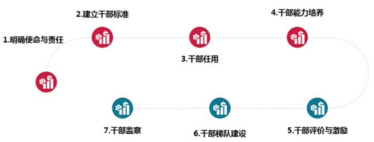华为的干部管理七步曲,包括:明确使命与责任;建立干部标准;干部任用程序;干部能力发展;干部评价与激励;干部梯队建设和后备干部培养;干部监察。