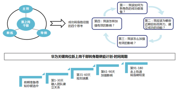 对于关键岗位的干部,如果管理跨度比较大,华为还会单独为他们做新干部上岗的90天转身辅导计划。
