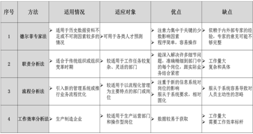 定编的方法也有很多,比如德尔菲专家法、职责分析法、流程分析法、工作效率分析法等。各自有其优缺点。具体如下: