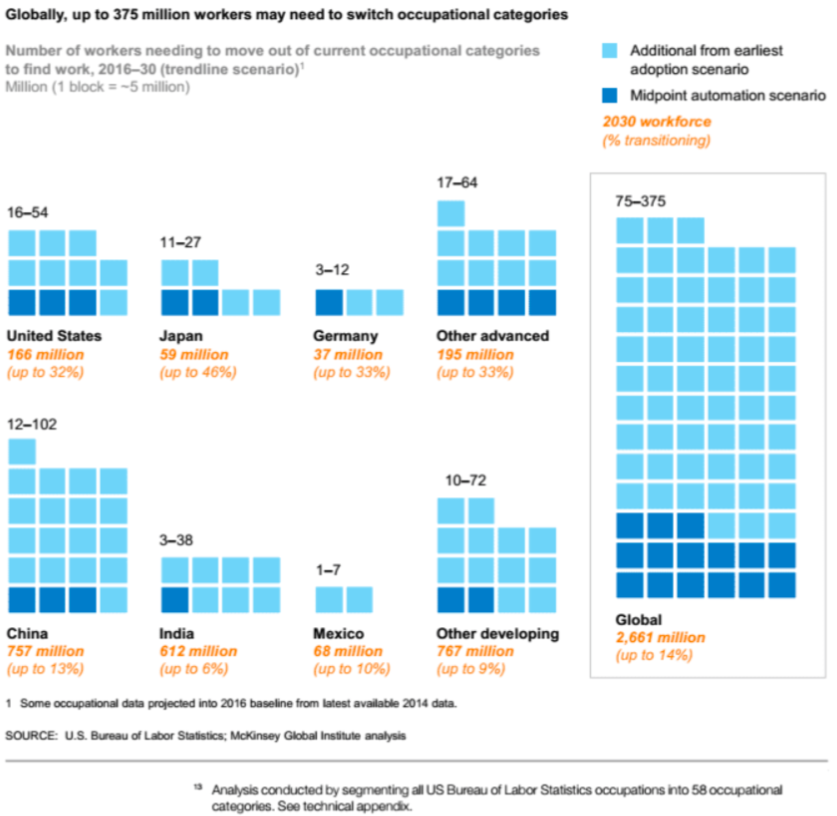 但是实际情况却不能把人才冗余问题一棍子打死,首先,冗余是绝对的,没有不存在冗余的企业,用现在比较流行的话说,企业发展是克服“熵增”的过程,熵是永远存在的,冗余既是一种熵,因此应对人才冗余,重要的是将其控制在合理的范围内,比如人力资源结构上的冗余,对于企业应对突发状况,如大规模人才流失,或解决短时间市场扩展问题是能起到一定作用的;其次,企业的发展本身就是一个“均衡—不均衡—均衡”的过程(彭罗斯的企业成长理论),尤其是在VUCA时代,需要快速应对的变化有很多,如何在不均衡中寻找动力成为关键问题,因此而带来的人才冗余也是必然要接受的,这一点,不仅对于企业适用,从处于变革期的社会也同样如此,如麦肯锡2017年1月的“JOBS LOST, JOBS GAINED: WORKFORCE TRANSITIONS”报告所显示的,随着互联网及数字技术的发展,预计2030年,全球有3.75亿人面临转岗问题,如下图所示,列举了美国、日本、德国、中国、印度、墨西哥等国家的面临的转岗人数,假如我们把不同的国家比作不同行业不同发展阶段的企业,那即可将这种转岗的趋势看作不同行业生态下,各企业所面临的刚性的人才冗余问题。