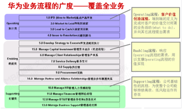 流程是华为内部沟通的语言与沟通方式,也是华为核心价值观——以客户为中心,在业务领域最直观的体现。华为的流程始于客户需求的牵引,而且在内部的流程接续上也是服务导向,面向“客户”交付。以下是华为的流程框架图,业务流程涵盖了经营管理的各大领域和条线。