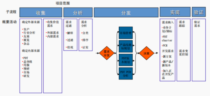 需求管理流程分为收集、分析、分配、实现和验证5个阶段。其中需求收集、分析、分配主要在产品规划、项目任务书(charter)开发在IPD流程的概念阶段进行,实现和验证阶段流程主要在IPD产品开发流程中实现。