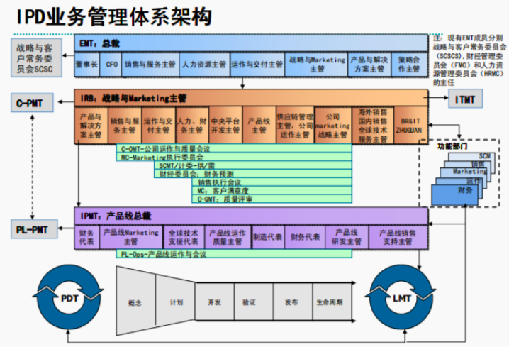 IPD中有一个明星细胞组织—PDT。IPD是将产品研发的相关环节统一到一个团队中——PDT(产品研发团队),团队由核心组以及扩展组构成,并通过分布式计划进行项目的推进与落地。