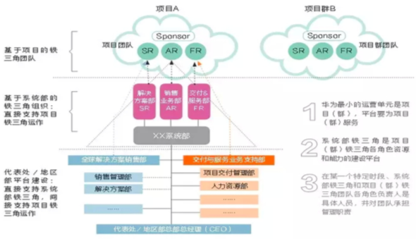 基于失利的教训,华为苏丹代表处对团队整体的组织结构进行了重塑:打破原有部门的边界束缚,围绕用户需求,有效协同客户关系、产品与解决方案、交付与服务、商务合同、融资回款等独立部门;围绕特定的客户项目,组建专门的核心管理团队,将以往复杂多样的客户接口协调统一,更有效地帮助客户创造商业价值。苏丹办事处的项目管理团队以客户经理(AR)、解决方案专家/经理(SR/SSR)、交付专家/经理(FR)为核心,建构出一个面对面主动对接客户、聚焦项目、能够快速反馈和响应的一线作战单元,从而更深入精准地理解把握了客户需求。这种项目核心管理团队的组织模式被形象地称为“铁三角”。