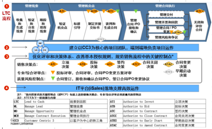 在LTC的实施中,一方面与财经变革中的“从机会点到回款”,以及此前已经存在“铁三角”都进行了呼应与融合,集成了已经存在的相关经验,而且,铁三角在LTC的实施中发挥了良好的效果,提高了LTC流程的交付效率。