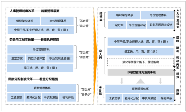通过人力资源管理的六大模块,我们将三项制度改革的相关内容进行解构,以人力资源管理的逻辑对三项制度改革进行二次解读,使三项制度改革的逻辑更加清晰。