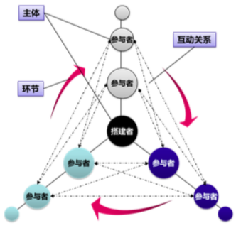 互动关系:平台内每个主体(包括平台制造者和参与者)都带有自己的诉求,并具备独特的资源与能力。平台主体间因为需求、资源和能力的吸引,相互交流并产生交易,形成不同形式、场域、复杂程度的互动关系。互动过程会伴随物流、商流、信息流、人才的流动和交换。