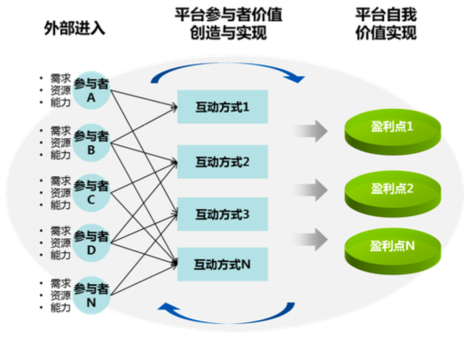 Permutation:置换,互动,代表价值创造过程。平台内各主体间互动、交易,自身需求得到满足,自身资源、能力为其他主体产生价值。