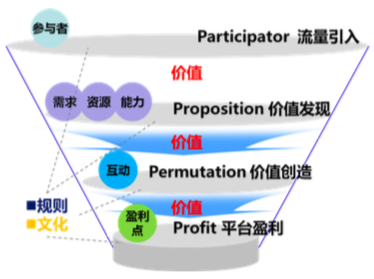 4PRC模型也可以通俗地称为漏斗模型,平台思维就像一个漏斗,需要层层筛选和过滤,对平台参与者分类分层次,对平台内各种需求、资源、能力分类分层次,对平台互动模式分类分层次,对平台可能的盈利点分类分层次,最后沉淀在底层的,就是平台自我价值的实现。