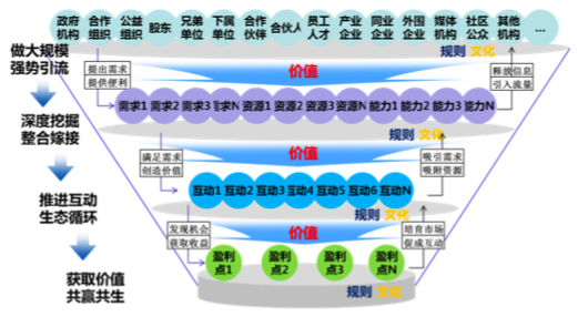 共赢:共赢是平台化运行的前提,只有平台参与者借助平台能够满足所需,获得收益,平台才具有粘性。同时,共赢也是平台化运行的结果,平台构建了一个多边市场,各主体在市场交易,创造价值,促成平台的繁荣,平台制造者及各伙伴将会共享市场繁荣带来的收益。