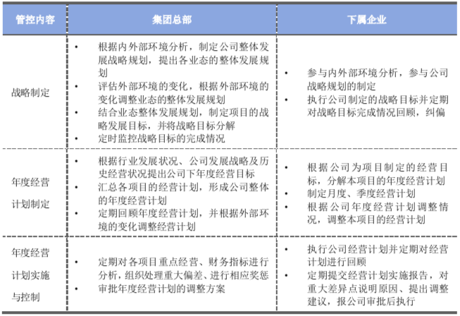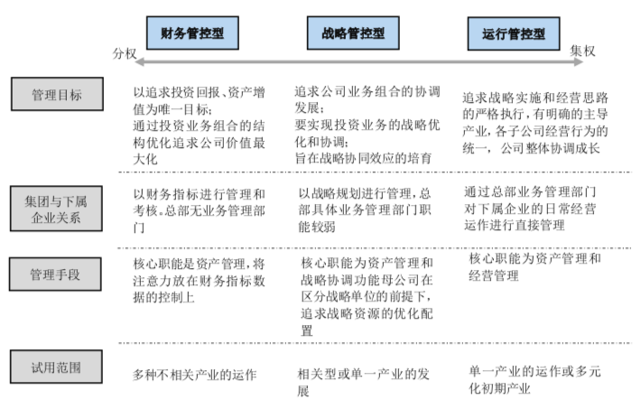 明确企业的战略后,依据业务发展定位选在合适的管控模式,通常来说集团对下属单位的管控模式依据集权程度分为财务管控型、战略管控型和运行管控型三种模式。而在实际操作中,根据业务发展的不同特点,又衍生出战略财务型管控和战略运行型管控两种模式。