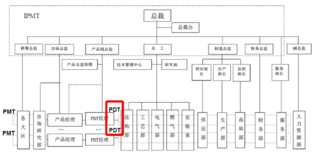 IPD改革后,产品研发改由PDT(产品开发团队)承担,产品开发直接由产品线管理团队管理。每个产品都有各自的PDT,每一个PDT团队由研发、市场、财务、采购、用户服务、生产等各部门抽调的代表组建。PDT采用“重度矩阵结构”模式,保证沟通、协调和决策的高效。
