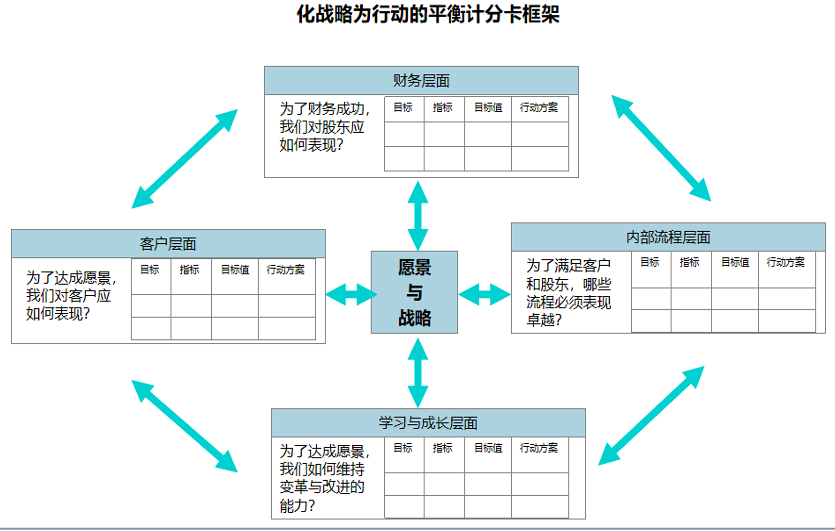 战略被转化为具有因果关系的四个层面的具体指标:财务、客户、内部流程、学习与成长。