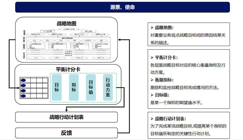 “图”即是战略地图,战略地图用来描述企业的战略,通过战略共识在组织内部形成大家认可的战略主题与战略目标。