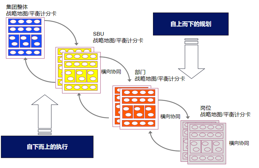 各SBU(子公司,战略经营/业务单位)BSC体系开发过程与集团层面基本一致,通过绘制SBU战略地图,承接集团战略要求,并把SBU需要关注的重点在战略地图上体现出来,形成可视化的管理,在集团战略地图上的战略举措如果仅与单一SBU相关,由一个SBU来承担落实,这项举措就直接落在该SBU战略地图上,如果某些战略举措涉及到跨SBU的协调和配合,就要将这些举措进行分解,依据相关SBU的职责分别是予以落实。