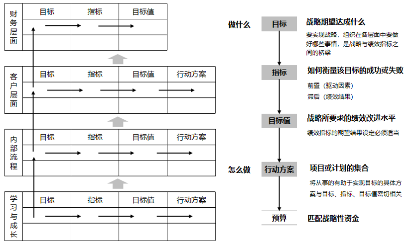 每个层面下结构化模式:战略目标、评价指标、目标值、行动方案。