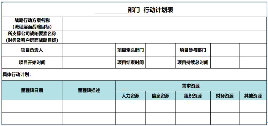 “表”即是战略行动计划表,战略行动计划表用来落实企业的战略,通过对平衡计分表明确的关键举措制定战略行动计划表,明确战略举措的推进步骤、时间节点与责任人,以加强战略举措实施的计划性,并为做好监控打下基础。
