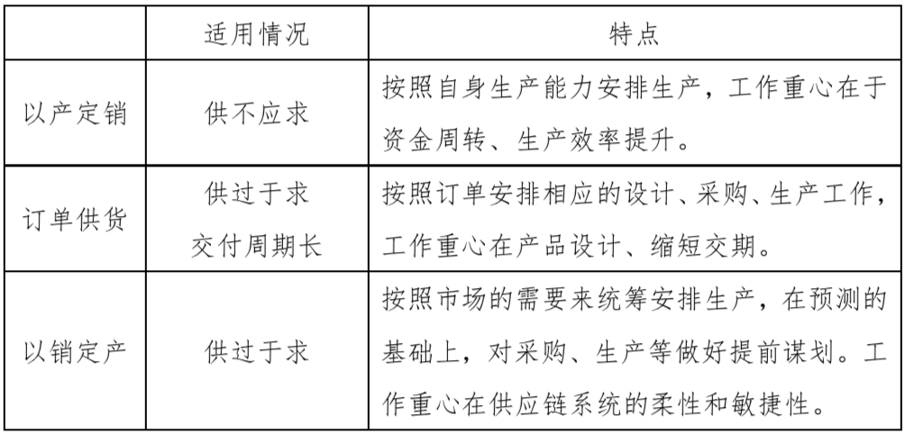 采用“以销定产”模式的主要核心思想是在“小批量、规模化”产品需求导向下,企业根据产品特点,将自身产品做“模块化”处理。依据市场订单需求,采用模块化组合、提前备货的方式安排生产,只有少数个性化需求的部分采用追逐式生产方式。