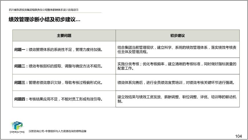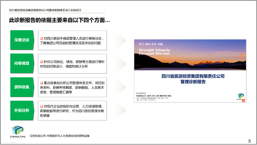 项目启动后,项目组通过深度访谈、问卷调查、资料收集、外部分析四个方面对集团现状进行全面诊断,发现目前存在的问题并提出四大核心举措,明确改进思路。