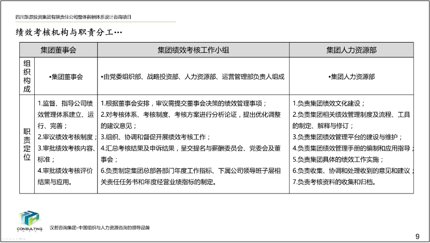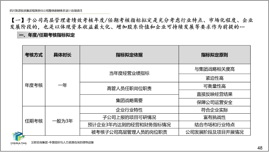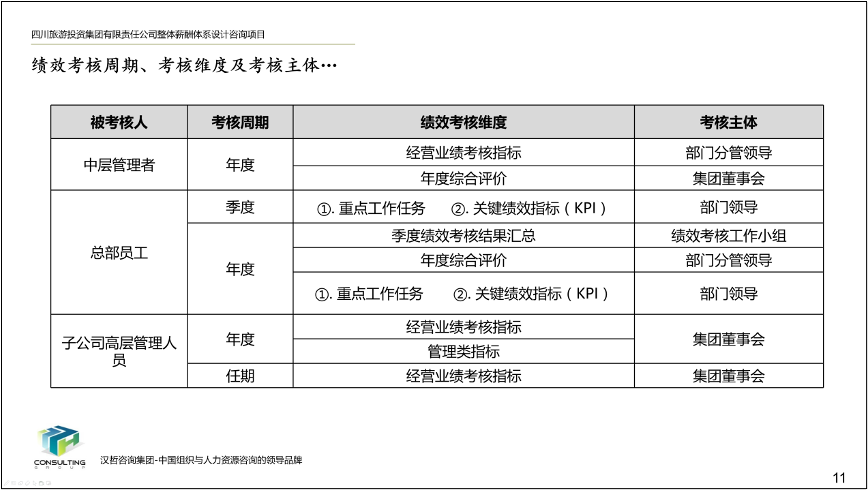 1、优化集团和子公司经营业绩考核办法。根据集团战略目标和子公司的功能定位、业务特点,集团总部实行年度考核,所属子公司实行年度考核与任期考核相结合的方式,遵循战略导向、团队导向、客观公正、分类考核的原则,制定各部门考核指标、考核程序、考核计分办法,形成经营业绩考核办法,提高激励作用,为实现集团战略目标夯实基础。
