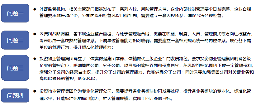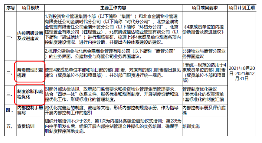 3、从金隅投资物业本次咨询需求看,不单纯是传统的模板化、制式化的内控文本体系建设,而是在职责澄清、制度及流程优化方面,也提出了更深层次的要求: