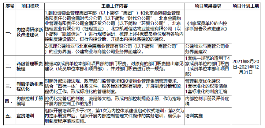 根据投资物业管理集团内部控制体系规划,为加快实现内控体系同业管控,针对金隅时代分公司、金隅环贸分公司、北京钰珵置业有限公司、北京凯诚信达物业管理有限公司的实际需求,拟为四家公司共同选聘1家咨询机构,建立1套适合公建物业类企业的内控体系: