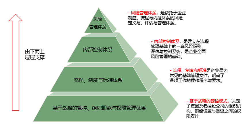 2、基于伟德国际betvlctor1946多年来开展管控、内控及风险管理的经验,建立企业全面风险管理体系应包含以下四个层次: