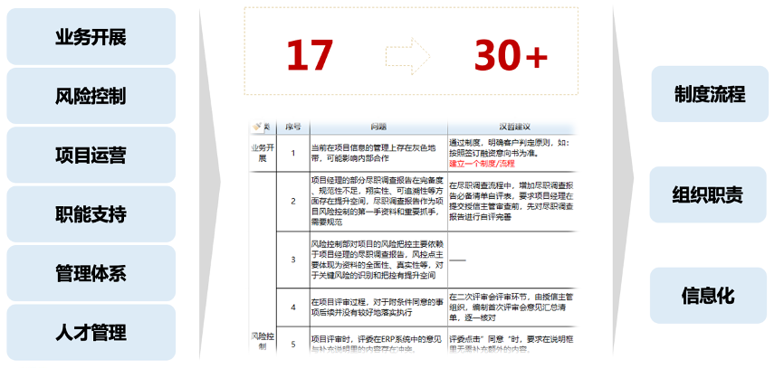 项目组从业务开展、风险控制、项目运营、职能支持、管理体系、人才管理等维度开展评估,提出问题优化建议。