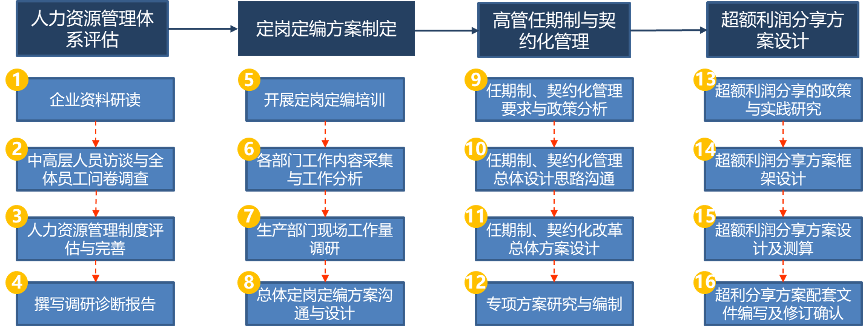 整体解决方案分为四个阶段:人力资源管理体系评估、定岗定编方案制定、高管任期制与契约化管理、超额利润分享方案设计。如下图: