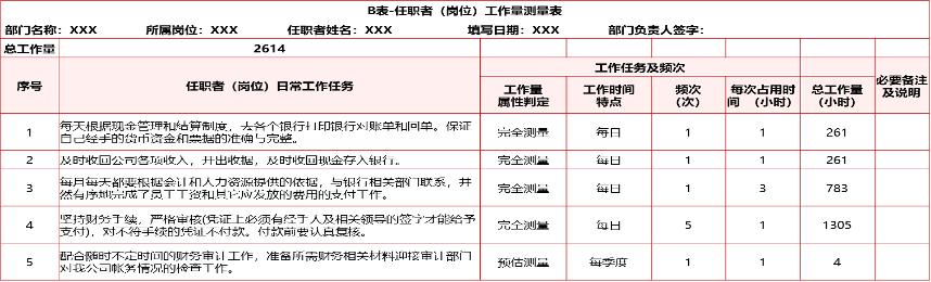 (3)工作量测量法:是通过对员工的实际工作时间进行统计分析,计算部门编制弹性系数及各员工工作负荷度,以衡定部门及岗位员工编制的合理性。如下表: