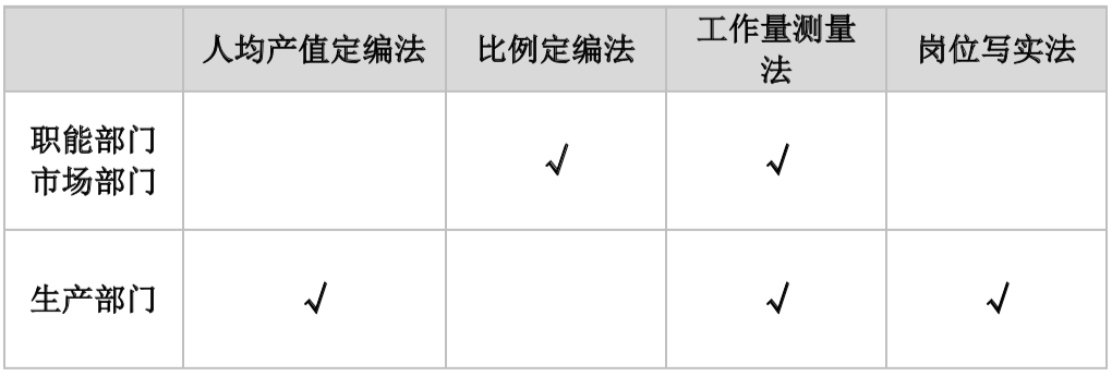 (2)比例定编法:是指通过设定不同类型人员的比例,在总量确定的基础上,核定各类人员数量的方法。计算公式:部门/类型人员数量=该部门/类型人员比例×企业员工总数。其中:不同部门、类型人员比例通常运用行业对标、历史数据分析、工作量测量等方式确定;