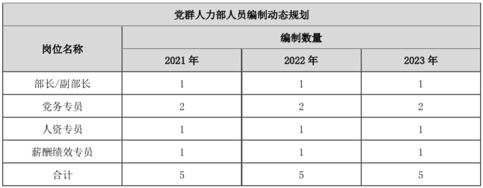 (1)职能、市场类部门定岗定编方案:通过《定岗定编职能套表》的履职情况评估、DPE岗位分析与工作量测量,并结合实际情况(战略目标、重点任务、人员能力等),对各部门职责进行梳理,对各岗位进行撤销、合并、拆分、增设或职责调整,并对未来两年(2022年、2023年)的编制提出建议,如下表: