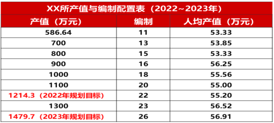 (3)生产部门数据收集:收集各生产部门近四年的人员数量、部门产值、合同金额等历史数据,并通过公司“十四五”战略规划与经营发展部提供的数据测算,确定各生产部门在2022年与2023年的未来产值目标。