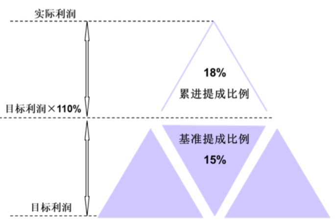 (2)确定超额利润提成额的计算公式:为充分激励项目公司的骨干员工,提成比例分为“基准提成比例”和“累进提成比例”,分别针对不同超额部分设定,如下图: