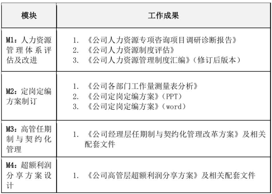 (1)人力资源制度评估:对公司现有16项人力资质制度进行评估,并提出修改意见;