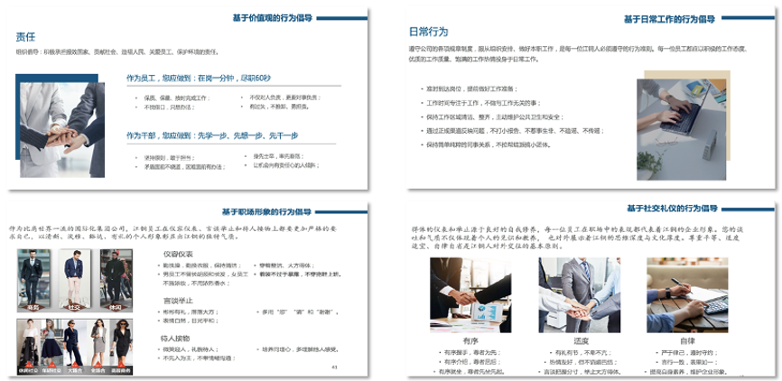 企业文化行为体系是企业文化核心理念在行为层面的延伸,既是对全体员工在工作中应遵循的关键行为提出的倡导和建议,也是员工践行企业文化的具体要求和规范。在这部分内容里,项目组从价值观、日常工作、职场形象和社交礼仪四个层面分别对关键行为进行了具体描述。