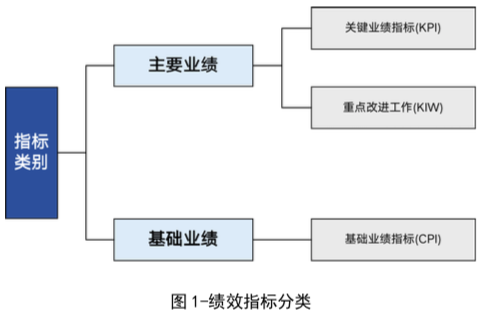 不同考核方式绩效指标分类不同。本文的绩效指标是以关键业绩指标(KPI,Key Performance Indicator )、重点改进工作(KIW,Key Improvement Works)和基础业绩指标(CPI,Common Performance Indicator)三类指标构成的指标体系。指标覆盖了了企业的经营类、管理类、专业类、协调类等工作,可以实现对企业与员工绩效系统性考核与评价。见图1-绩效指标分类。