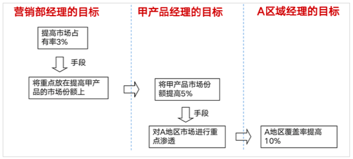 上下级目标具有较强的承接关系。下级目标是上级目标实现的必要条件(不是充分条件),下级目标是对上级目标的分解(是上级目标实现的手段),下级目标不是对上级目标的平均分配。以某公司营销部不同岗位员工市场占有率指标为例,详见如下: