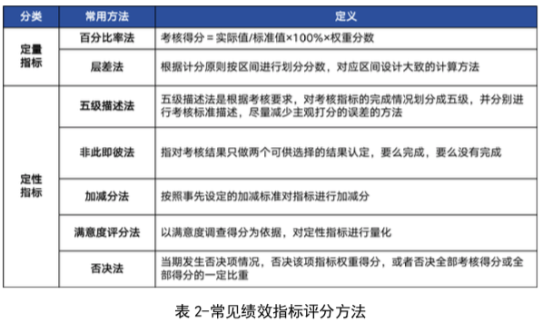 绩效考核指标一般分为定性指标与定量指标两类,不同指标的评分规则与评分方法不同,详见表2-常见绩效指标评分方法。