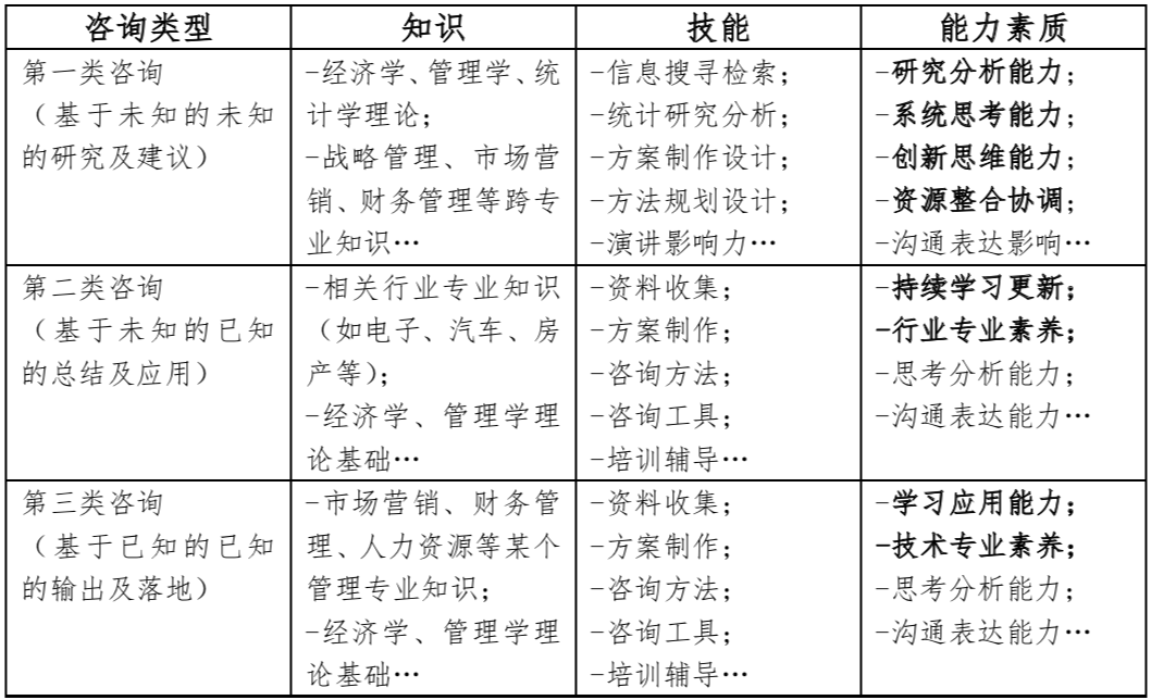 那么,相应的咨询师在知识、能力、素质上的要求就有区分了。除了学习、思考、分析、总结、沟通等作为智力工作者的基本要求外,第一类咨询从业人员,更强调高阶的研究、系统思维、跨界的融合和客户影响力,他们不只是知识的搬运工,更是领域专家和社会精英。第二类咨询从业人员,更强调其行业性,更强调其所处行业信息和知识的领先性以及跨界专业的融会贯通,其往往是行业专家,对于行业历史、动态、标杆甚至行业专业技术了如指掌。第三类咨询从业人员,更强调其专业性,人力资源、会计、律法等相关专业,对于相关政策法规、专业案例、专业知识要求高于客户的积累,到了更高阶的时候,对于跨专业的知识掌握也会有更高的要求。
