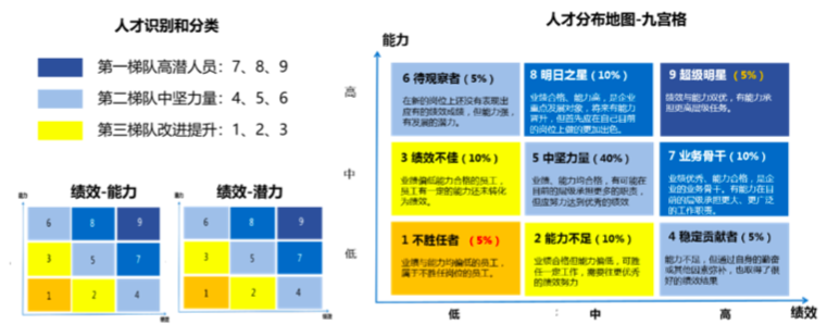 人才盘点的重要输出成果人才分布地图-九宫格,通过绩效与能力、能力与潜力两个维度,可以把人员划分到九个不同的位置中,在后续的人才管理中会针对不同类型人才给予不同的管理策略,从而更精准、有效地配置资源。