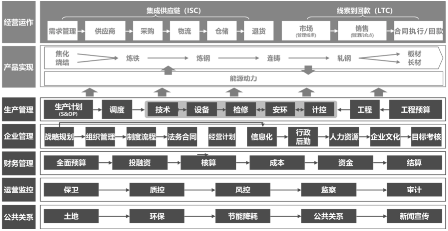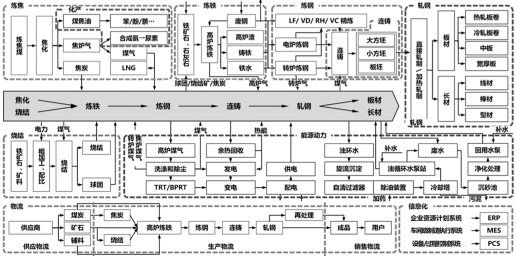 一、开展工艺流程梳理分析。不同的钢铁企业具有多种业务,一些只到炼铁,一些只从轧制开始。因此,各业务间的配合,包括前端产品与后端产品的匹配等,是分析钢企工艺流程的关键要素。笔者所咨询的钢企,由10个业务板块构成的涵盖全产业链的炼钢企业。其工艺流程分析结果如下图所示: