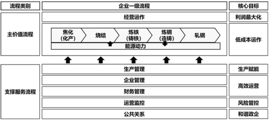 二、进行一级流程梳理分析。根据企业价值链(本文略过),借鉴流程管理最佳实践,对企业业务运行的一级流程模块进行梳理,并将其分为两大类:主价值流程(经营运作、产品实现)、支撑服务类流程(生产管理、企业管理、财务管理、运营监控、公共关系)。同时,根据不同的一级流程在企业运行过程中的定位,进一步明确一级流程的核心目标,如下图所示: