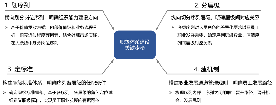 职级体系建设项目整体按“划序列、分层级、定标准、建机制”四个步骤开展工作: