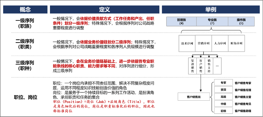 序列划分由粗到细换分为三级序列(职族、职类、职种),一级序列按照价值贡献方式划分,二级序列按照价值链划分,三级序列在价值链基础上按照专业职能条线进一步细分。